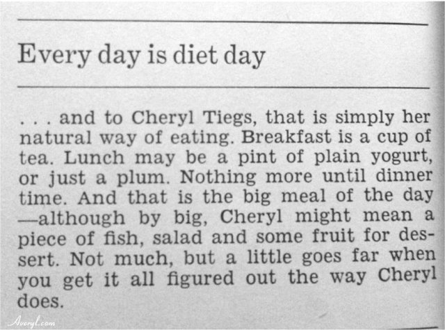 Diets that referenced “Hollywood” or “The Stars” were a thing, as were feature articles that purportedly revealed the eating habits of stars like Marilyn Monroe, Twiggy and Cheryl Tiegs so women could emulate them: